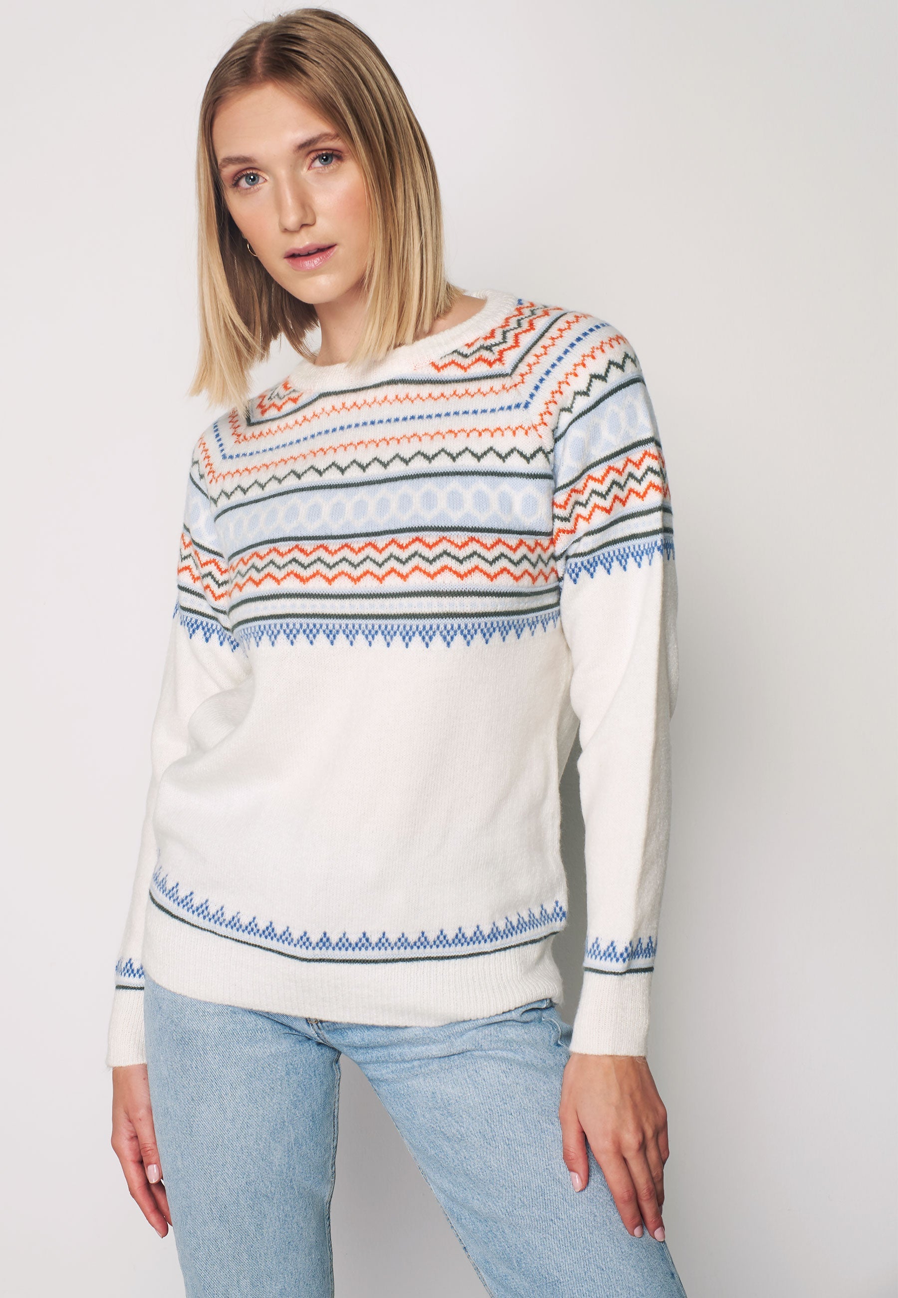 Soft Long Sleeve Blue Detailed Pullover - White